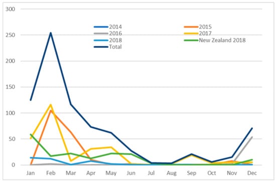 Seasonal distribution of Australian cases identified from 2014 to 2018 and of cases diagnosed in New Zealand in 2018.