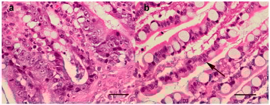 Small intestine, case 221, HE staining, scale bar 50 µm. (a) 600× Crypt epithelial cells are degenerating or necrotic and often sloughed into crypt lumens, (b) 1000× a villous epithelial cell contains an amphophilic intranuclear inclusion body which marginates the chromatin (arrow).