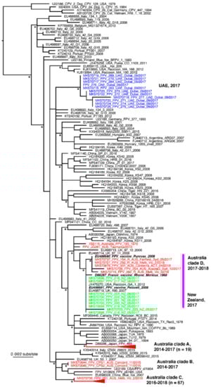 VP2 sequences were edited, assembled and aligned using the ClustalW algorithm in Geneious Prime (Biomatters Ltd., Auckland, New Zealand) (although alignment was uncontroversial with no gaps needed). Sequences were translated in MegaX, and amino acid substitutions compared to the ICTV reference FPV sequence (FVP-3 Genbank accession no. EU659111) were identified. To determine the evolutionary history of the outbreak sequences from Australia, New Zealand and Dubai, we performed a phylogenetic analysis including these sequences and representative VP2 sequences of FPV and CPV taken from GenBank. In addition, we included an FPV VP2 sequence obtained from tissues of a healthy feral cat from Tasmania, Australia, sampled in 2010 (Genbank accession no. MN603976), for comparison. This resulted in a total data set of 205 sequences, 1774 nt in length. Phylogenetic analysis of these was performed using the PhyML program [13] and employing the GTR+I+Γ model of nucleotide substitution and a combination of Nearest-Neighbor Interchange (NNI) and Sub-tree Pruning & Re-grafting (SPR) branch swapping. Nodal support was assessed using SH-like branch support. Finally, the five CPV sequences included were used as an outgroup clade to root the tree.