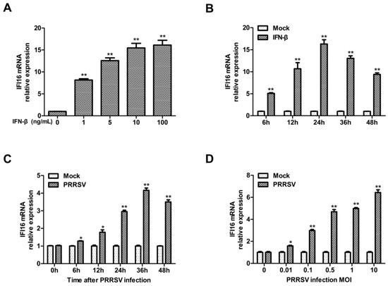 Since type I interferon and interferon-induced genes could efficiently inhibit PRRSV replication in MARC-145 cells [,], and it has been reported that IFI16 could be induced by type I interferon [,,], we firstly confirmed whether IFI16 could be induced by type I interferon in MARC-145 cells, and then explored whether IFI16 could inhibit PRRSV replication. MARC-145 cells were treated with IFN-β, and then the expression of IFI16 was detected. Consistent with the results of previous reports, IFN-β could also efficiently induce the expression of IFI16 (Figure 1A), and the expression of IFI16 was enhanced in an IFN-β-dose-dependent manner and peaked at 24 h in MARC-145 cells (Figure 1B). In addition, the transcription level of IFI16 was increased in the cells infected with PRRSV-2 (Figure 1C,D).