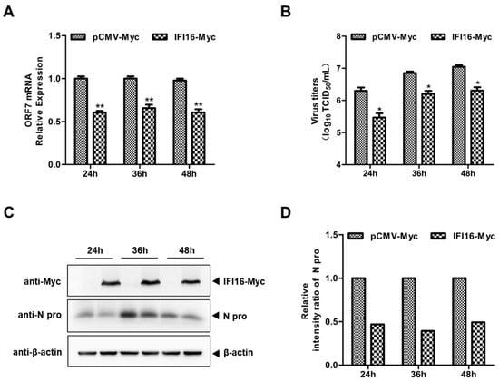 Overexpression of IFI16 inhibits PRRSV-2 replication. MARC-145 cells were transfected with IFI16-Myc or control vector for 24 h, and then infected with PRRSV-2 BJ-4 at a MOI of 0.1 for another 24, 36, and 48 h. (A) The RNA levels of PRRSV were assessed by RT-qPCR. (B) The virus titers were assayed by TCID50 (50% tissue culture infective dose). (C) The expression levels of IFI16 and N protein of PRRSV were analyzed by western blotting. (D) The relative intensity ratios of N protein were also shown in this figure by using Image J software. All experiments were repeated at least three times with similar results. * p < 0.05, ** p < 0.01.