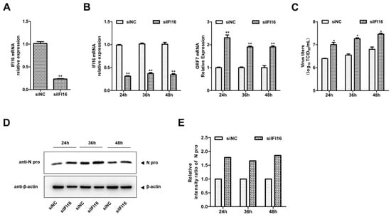 Knockdown of IFI16 enhances PRRSV-2 growth. (A) MARC-145 cells were transfected with siIFI16 or a nontargeting control (siNC) for 48 h, the knockdown efficiency of IFI16 was examined by RT-qPCR. (B) MARC-145 cells transfected with siIFI16 or siNC were infected with PRRSV-2 BJ-4 at a MOI of 0.1 for 24, 36, 48 h. The mRNA levels of IFI16 and PRRSV ORF7 were assessed by RT-qPCR. (C) The virus titers were analyzed by TCID50. (D) The expression levels of N protein were detected by western blotting with a rabbit anti-PRRSV N protein polyclonal antibody. (E) The relative intensity ratios of N protein were analyzed by Image J software. All experiments were repeated at least three times with similar results. * p < 0.05, ** p < 0.01.