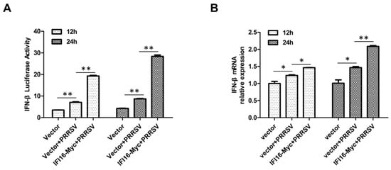 IFI16 enhances PRRSV-induced production of IFN-β. (A) MARC-145 cells were transfected with IFI16-Myc or control vector and IFN-β reporter plasmid, and 24 h later, the cells were infected with PRRSV-2 BJ-4 at a MOI of 1 for 12 h or 24 h, and then the luciferase activities were assayed. (B) MARC-145 cells were transfected with IFI16-Myc or control vector for 24 h, then infected with PRRSV-2 BJ-4 at a MOI of 1 for 12 h or 24 h, and the mRNA levels of IFN-β were measured by RT-qPCR. All experiments were repeated at least three times with similar results. * p < 0.05, ** p < 0.01.