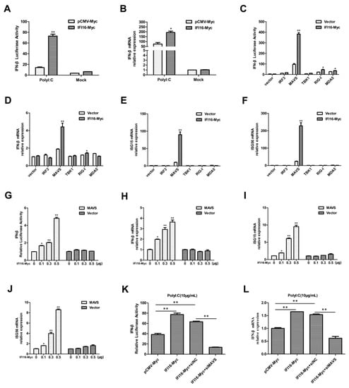 IFI16 enhances MAVS-mediated type I IFN signaling. (A) MARC-145 cells were transfected with IFN-β reporter plasmid and IFI16-Myc or control vector, and 36 h later, the cells were transfected with polyI:C (10 µg/mL) for 12 h, and then the luciferase activities were assayed. (B) MARC-145 cells were transfected with IFI16-Myc or control vector for 36 h, then transfected with polyI:C for 12 h, the mRNA levels of IFN-β were measured by RT-qPCR. (C) MARC-145 cells were transfected with IFN-β reporter plasmid, IFI16-Myc, and IRF3, MAVS, TBK1, RIG-I, or MDA5 plasmids. Luciferase assays were performed at 48 h. (D–F) MARC-145 cells were transfected with IFI16-Myc and IRF3, MAVS, TBK1, RIG-I, or MDA5 plasmids. The mRNA levels of IFN-β (D), ISG15 (E), and ISG56 (F) were detected by RT-qPCR. (G) MARC-145 cells were transfected with IFN-β reporter plasmid, MAVS, and increasing amounts of IFI16-Myc, at 48 hpt, the luciferase activities were analyzed using a dual-luciferase reporter assay. (H–J) MARC-145 cells were transfected with MAVS and increasing amounts of IFI16-Myc, the mRNA levels of IFN-β (H), ISG15 (I), and ISG56 (J) were detected by RT-qPCR. (K) MARC-145 cells were transfected with IFN-β reporter plasmid, IFI16-Myc, and siNC or siMAVS for 36 h, then the cells were stimulated with polyI:C, and 12 h later, the luciferase activities were assayed. (L) MARC-145 cells were transfected with IFI16-Myc and siNC or siMAVS for 36 h, and then the cells were stimulated with polyI:C, and 12 h later, the mRNA levels of IFN-β were quantified by RT-qPCR. All experiments were repeated at least three times with similar results. * p < 0.05, ** p < 0.01.