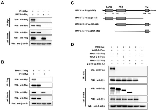 IFI16 is mainly localized in nucleus and partially localized in cytoplasmic and mitochondria [], while MAVS could localize in cytoplasmic and mitochondria []. Besides, IFI16 could facilitate the MAVS-mediated type I IFN signaling, so to determine whether IFI16 could interact with MAVS, the co-immunoprecipitation assays (co-IP) were performed in 293T cells, and the results showed that IFI16 specifically interacted with MAVS (Figure 6A,B).