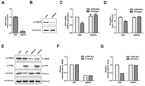 The antiviral activity of IFI16 is dependent on MAVS. (A,B) MARC-145 cells were transfected with siMAVS or siNC for 48 h, the silence efficiency of MAVS was examined by RT-qPCR and western blotting. (C) MARC-145 cells were transfected with siMAVS and IFI16-Myc, and 24 h later, and the cells were infected with PRRSV-2 BJ-4 at a MOI of 0.1 for 24 h. Then, the cells were harvested, and RNA levels of PRRSV were determined by RT-qPCR. (D) The virus titers from cell supernatants were analyzed by TCID50. (E) The expression levels of N protein were detected by western blotting. (F,G) The relative intensity ratios of MAVS and N protein were analyzed using Image J software. All experiments were repeated at least three times with similar results. * p < 0.05, ** p < 0.01.