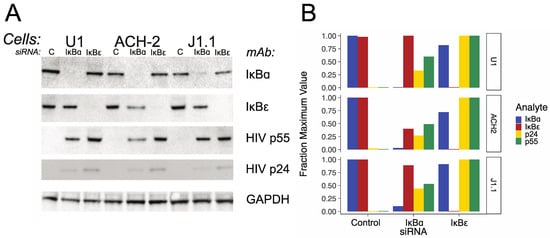 Effects of IκB siRNAs on IκB protein and HIV protein expression in U1, ACH-2, and J1.1 cells. (A) Composite immunoblot. Cell lines used in this experiment are indicated at the top of the figure, with the individual siRNA used in the experiments run in each lane indicated beneath. The designations to the right of the figure indicate the target of the mAb used for each immunoblot. (B) Immunoblot quantitation. Bands from panel A were quantitated using ImageJ normalized to the GAPDH control, and then for each condition, normalized against the condition yielding the maximum value. The fraction of the maximum values for each condition are indicated on the left side of the panel, cell lines are indicated on the right side of the panel, and the control and/or siRNAs transfected in each experiment are indicated at the bottom of the panel.