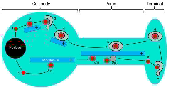 Alphaherpesvirus anterograde traffic in neurons. Capsids (red discs) are assembled and packaged with DNA in the nucleus, then emerge into the cytoplasm. Steps 1–6: married model. Naked capsids (1) acquire inner tegument and recruit kinesin to traffic along MTs (2) to their site of envelopment in the cell body (3). The resulting OEVs (4) then utilize MTs for delivery into and along the axon (5) eventually arriving at the nerve terminal for exocytosis and spread (6). Steps a–e: separate model. Naked capsids (a) acquire inner tegument and recruit kinesin to traffic along MTs (b) into the axon and along axonal MTs as naked capsids [c(i)]. In a variant of the separate model the naked capsid hitch-hikes on the surface of an anterograde trafficking carrier vesicle [c(ii)]. In both cases, the naked capsid moves down the axon separately from the lipids and proteins of its envelope. After arriving at the nerve terminal (d), the capsid is enveloped (e) to generate organelle-bound infectious virions indistinguishable from those delivered by the married model (6).