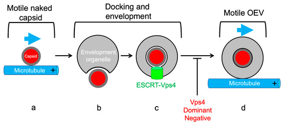 Since HSV-1 [137,142] and PRV [142] utilize the ESCRT apparatus (Section 5.3) to complete envelopment [13], the process can be arrested by expression of a dominant negative allele of Vps4 (vacuolar protein sorting 4), a cellular AAA ATPase that completes ESCRT-mediated scission, and envelope sealing (Figure 5) [143,144,145]. The resulting arrested intermediates, capsids partially but not completely enclosed by membrane, resemble an egg sitting in an eggcup [134,137]. Interestingly, we found that for both HSV-1 and PRV these trapped assembly intermediates were incapable of trafficking along MTs in an in vitro system (Figure 5), even though MT-directed trafficking of naked capsids and fully mature OEVs was normal [142]. Inhibition of motility was not an artifact of arresting envelopment with the dominant negative allele of Vps4, because the rare and short-lived population of partially enveloped capsids undergoing normal envelopment in the presence of wild-type Vps4 were also unable to move along MTs until envelopment had been completed [142]. Thus, while “precursor” naked alphaherpesvirus capsids and “product” OEVs can traffic along MTs, ESCRT-associated envelopment intermediates cannot (Figure 5). Although this mechanism remains to be demonstrated in vivo, we have hypothesized that this reflects an assembly checkpoint: once naked capsids have trafficked to and entered the envelopment pathway, any further MT-dependent trafficking is prevented until OEVs have been correctly assembled and the cargo of infectious virions is ready for export [142].