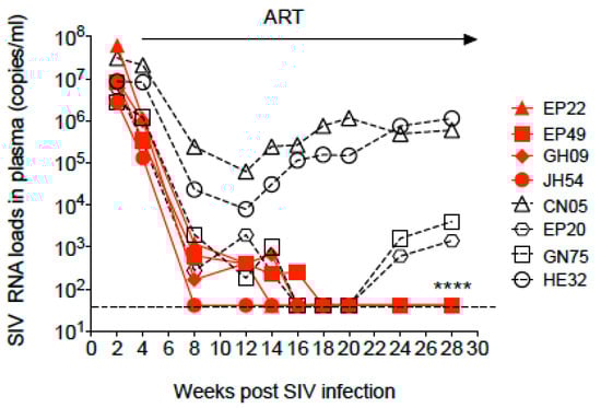 Eight cRMs were infected with SIVmac251. Viremia peaked at 2 weeks post-infection to the median of 8.5 × 106 copies/mL (ranging from 2.7 × 106–6 × 107 copies/mL) with the highest pVL in animal EP22. By the time of the initiation of ART at week 4 post-infection, the median pVL was reduced to 1 × 106 copies/mL (ranging from 1.3 × 105–2 × 107 copies/mL). ART was administered daily for 24 weeks (Figure 1). During ART, six animals reached undetectable plasma viral loads (pVL) at different time points, while two of them (EP20 and GN75) had detectable pVL again by the end of ART. The remaining four animals, EP22, EP49, GH09 and JH54, maintained undetectable levels until the time of euthanasia. Two animals, CN05 and HE32, had decreased viral loads in the 1st month of ART but maintained levels of 104–105 copies/mL similar to that of untreated animals as previously observed [], indicating mild or no response to ART.