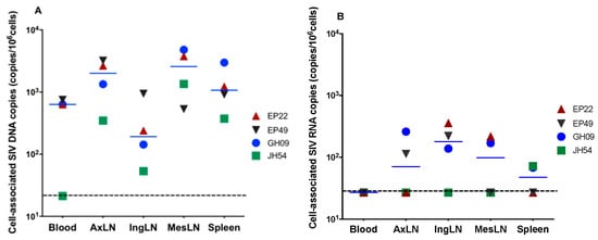 Levels of cell-associated SIV DNA (A) and RNA (B) in blood, axillary lymph nodes (AxiLNs), inguinal lymph nodes (IngLNs), mesenteric lymph nodes (MesLNs) and the spleen at the end of 6 months of ART in four animals with full viral suppression in peripheral blood. The dotted line indicates the limit of detection.