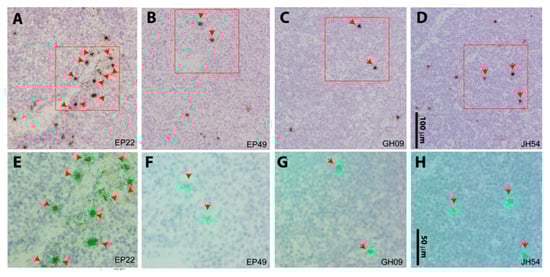 SIV viral RNA positive cells from mesenteric lymph node LN tissues. Viral RNA+ cells were readily detected in mesenteric LN tissues from all four aviremic animals using 35S riboprobe in situ hybridization. The SIV RNA-positive cells were overlaid by silver grains (black in transmitted light shown in the upper panel (A to D represent animals EP22, EP49, GH09, and JH54), and green under epipolarized light shown in the lower panel (E to H in correspondence with A to D) after radioautography for 14 days. The red box on the upper panel was highlighted at a higher magnification in the corresponding lower panel. Scale bars: 100 μm for the upper panel, 50 μm for the lower panel.