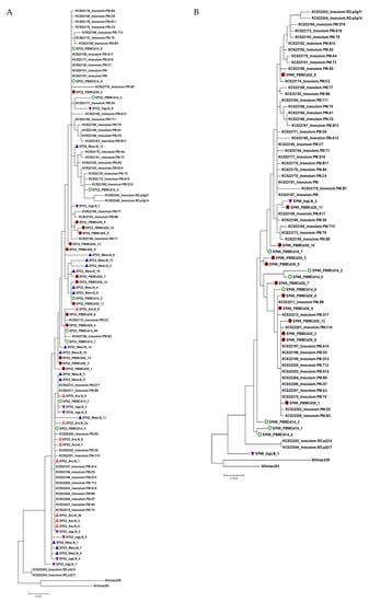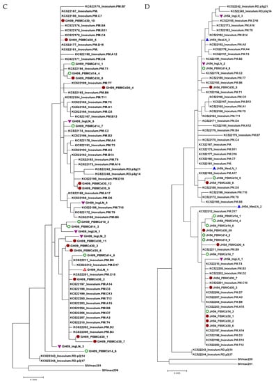 - Kumar, S.; Stecher, G.; Tamura, K. MEGA7: Molecular Evolutionary Genetics Analysis Version 7.0 for Bigger Datasets. Mol Biol Evol 2016, 33, 1870–1874. [Google Scholar] [CrossRef] [PubMed]