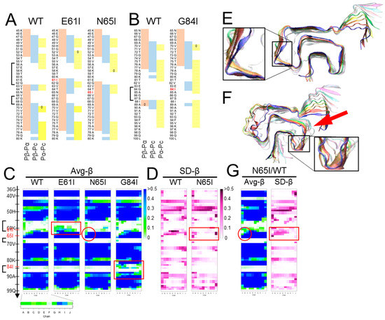 We chose the “Greek-key” αSyn amyloid (PDB ID: 2n0a) [17] as a representative model of an in-register parallel β-sheet amyloid, because of its intricately-interacting β-sheets, absence of proline, and paucity of aromatic amino acids, wherein its π–π interactions are not fully represented by the used force field. First, we compared predicted propensities with the results of MD simulations of the wild-type (WT) αSyn amyloid [61] to assess the relationship of the predicted propensities and the actual structures of αSyn amyloids in silico. Here, we used a set of modified parameters, Pβ-Pα, Pβ-Pc, and Pα-Pc, to clearly visualize magnitude correlations between two of the three conventional parameters, while the algorithm originally assigns a secondary structure of the highest value to a given residue, to assess whether the magnitude correlations between two have any significance on the structures. These predicted propensities exhibited some correlation with the actual average β-sheet propensity from the MD simulations (Figure 2B), suggesting certain influences of intrinsic propensities on structures of the amyloid. Positive (Pα-Pc) values (Figure 2B, left panel) indicated high α-helix propensities in theory, and indeed the N-terminal region with positive (Pα-Pc) values maintained a helix in the MD simulation of a native αSyn (PDB ID: 2kkw [64]), even in the absence of micelles (Figure 2D). The β-sheet in the region 89-95 with positive-(Pα-Pc) values (Figure 2B) yielded a similar contribution of high α-helix propensities to amyloid formation as reported in the literature, which explains why amyloidogenic proteins often have α-helices in native conformations, e.g., Aβ and PrP [65,66,67,68]. Given the correlation of the predicted propensity profiles with the structures of αSyn amyloid in silico, next, we introduced substitution mutations of isoleucine around the three loops encompassing residues 56–62 [loop(56–62)], 67–68 [loop(67–68)], and 84–87 [loop(84–87)] (Figure 2A), specifically Glu61Ile (E61l), Asn65Ile (N65I), and Gly84Ile (G84I), respectively (Figure 3A,B). Then, we analyzed their predicted propensities. G61I locally raised (Pβ-Pα) and (Pβ-Pc) values (Figure 3A, middle). N65I raised (Pβ-Pc) values in the loop (67–68) and the adjacent β-strands (Figure 3A, right). G84I raised (Pα-Pc) values to positivity through the loop and changed the positive-(Pβ-Pc) spot at the residue 80 to the wider one encompassing 82–84 (Figure 3B).