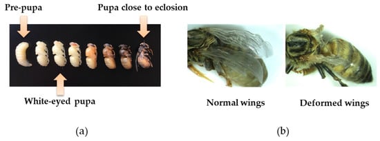 (a) White-eyed pupa used to generate deformed wing virus (DWV) inocula and in inoculation experiments, with prepupae to the left, and more advanced pupal stages to the right (each stage separated by ca. 24 hours); (b) left, normal winged adult; right, adult with deformed wings.