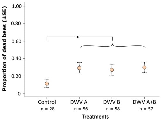 Mean proportion of dead honey bee pupae inoculated at the white-eyed stage with a control solution (virus-free extract of bees), deformed wing virus A (DWV-A) inoculum, deformed wing virus B (DWV-B) inoculum, or simultaneously DWV-A and DWV-B inocula, and dying before or at eclosion. DWV-inoculated bees suffered significantly higher mortality (mean 29%) than control bees (mean 11%; GLMM; χ2 = 4.140, p = 0.041) but mortality did not differ between virus-inoculated treatments (*, Tukey post hoc pairwise comparisons, all p > 0.05); *, p < 0.05.