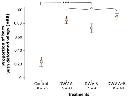 Mortality from day two p.i. through to eclosion was recorded daily as a measure of viral virulence. At day six to day seven p.i., adult workers eclosed. Then, the wing morphology of eclosing adults was inspected visually to determine the impact of virus on wing deformation (Figure 1b), which was another measure of viral virulence. To assess whether viral titer was related to wing deformation or the viral genotype, eclosing adult bees were stored at −80 °C for viral quantification exactly as described above (Section 2.2).