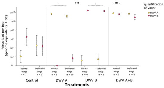 We note that the DWV-B titer in the adults that had received DWV A+B treatment and successfully eclosing with normal wings was slightly although significantly lower than the DWV-A titer in the same bees (quasi-Poisson GLMM; DWV-A versus DWV-B: z = −5.155, p < 0.001; Figure 4). However, differences in titer were small (Figure 4), and the result is based on only n = 2 successfully emerging bees. Therefore, we caution against the over-interpretation of this result.