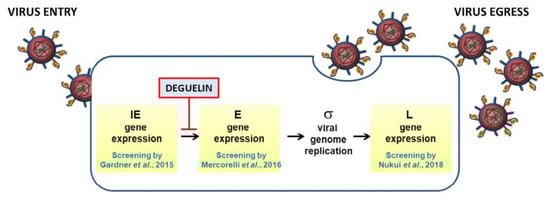 Different stages of the HCMV replication cycle targeted by drug repurposing campaigns. The schematic depicts the sequential steps of the HCMV gene expression cascade that have been targeted by the three indicated screening studies (IE, Immediate Early; E, Early; σ, sigma (stands for DNA replication by the rolling circle mechanism; L, Late). Deguelin is a flavonoid selected in the screenings by Mercorelli et al. [8] and Nukui et al. [9] and further characterized for its anti-cytomegaloviral activity and the ability to inhibit the expression of viral E genes.