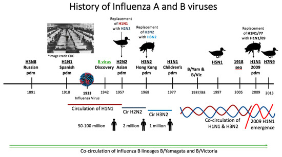The influenza A virus was first identified as the etiological agent of human influenza in 1933 shortly after the advent of electron microscopy [71]. Influenza B virus was discovered in the following decade [72,73] (Figure 3). Prior to virus discovery, the agent responsible for influenza-like epidemics/pandemics such as the 1918 influenza pandemic were not readily determined [74]. The constructed timeline (Figure 3) starting in 1889 shows the history of influenza A and B virus circulation in the human population. There have been six presumptive pandemics caused by influenza A viruses since 1889 that have defined the immunological landscape of humans. The Russian pandemic of 1889 and the 1918 pandemic occurred prior to the discovery of the influenza virus [1,6]. The etiology of these disease outbreaks was determined by seroarcheological studies by sampling people who had lived prior to and during the time of the epidemics. Seroarcheology and molecular clock analysis suggested an H3N8 virus and an H1N1 virus as the etiological agent of the 1889 and 1918 pandemics, respectively [74,75]. It wasn’t until the 1918 virus was sequenced (1997) then resurrected in 2005 that H1N1 was definitively shown to be the causative agent of the 1918 pandemic [26,76]. It is estimated that the 1918 H1N1 virus caused 50 to 100 million deaths worldwide between 1918 and 1919, establishing it as the deadliest pandemic known to modern history. Sequencing has suggested that the virus has both avian and swine origins [26,27,76,77]. After 1918 there were several introductions of H1N1 viruses into human circulation from zoonotic sources. Therefore, the H1N1 viruses which circulated until 1957 were not direct descendants of the original 1918 H1N1 virus but instead originated from other spillover events [75]. In 1957, H1N1 was replaced with an H2N2 virus during the Asian pandemic. This outbreak was responsible for 2 million deaths [1]. The H2N2 virus was usurped by the introduction of the influenza A virus subtype H3N2 of swine origin which emerged during the Hong Kong pandemic of 1968 [74]. The driving factor causing H2N2 virus replacement with H3N2 subtype has been hypothesized to be the population’s previous immunity to sub-immunodominant domains on the influenza virus, i.e., the HA stalk and the neuraminidase [28]. H3N2 circulated as the only influenza A virus for nine years, until H1N1 resurfaced in 1977. A possible laboratory escape, the 1977 resurfacing of the H1N1 virus is referred to as the Children’s Pandemic since older individuals were protected due to preimmunity to H1N1 viruses [1,78]. Since 1977, H1N1 and H3N2 have co-circulated in humans.