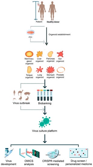 Applications of organoids on virus-mediated diseases. Potential applications of iPSC-derived and adult stem-cell-derived organoid systems for the viral pathogen outbreak are illustrated. Established organoids from different organs can serve as a proper virus culture platform for many purposes such as vaccine generation, OMICS analysis, CRISPR/Cas9-mediated screening, and drug screening for personalized medicine.