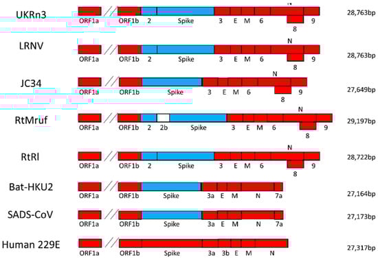 For the genome retrieval of the UK field vole CoV (UKMa1) and the Poland-resident bank vole (PLMg1), primer-walking PCR was not applicable due to the lack of a very close reference sequence. Thus, NGS performed on total RNA extracted from the Microtus agrestis gut and Myodes glareolus liver was used as an alternative method. Genome fragments representing 17,483 and 8603 nucleotides spanning various genes were retrieved for UKMa1 and PLMg1, respectively. Full-length N gene and partial ORF1ab, ORF2, S, ORF6, ORF8, and ORF9 genes were retrieved for UKMa1, whereas partial ORF1b and N genes were retrieved for PLMg1. For the L232 coronavirus, which was obtained from a rabbit living in France [], additional sequences up to 621 bp of the ORF1b gene were retrieved by targeting conserved regions with PCR. Unfortunately, presumably due to the relatively poor quality of the recovered nucleic acid, we were unable to recover additional sequences.