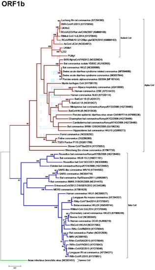 Reference sequences of α, β, and one γ-CoV were downloaded from GenBank for the ORF1b, S, and N genes and aligned using ClustalW [] recognising codon positions. To provide evolutionary context, phylogenetic analyses were performed using the maximum likelihood (ML) method within the Molecular Evolutionary Genetics Analysis version 7 (MEGA7) [] package. These analyses utilized a General Time Reversible (GTR) nucleotide substitution model with a gamma distribution of rate variation, a class of invariant sites (Γ+I) model of evolution, and complete deletion of gaps, with statistical robustness assessed using bootstrap resampling (1,000 pseudoreplicates). Equivalent ML phylogenies were also inferred using partial ORF1b, S, and N amino acid sequences and employing the Jones-Taylor-Thornton (JTT) substitution model with uniform rates, complete deletion of gaps, and statistical robustness of 1000 pseudoreplicates. Details regarding the number of sequences used for the phylogenetic analysis of each gene along with their length are given in Table 2, and the coronavirus reference sequences used in the phylogenetic analysis are given in Tables S1 and S2.