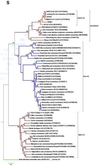 - Lau, S.K.; Woo, P.C.; Li, K.S.; Tsang, A.K.; Fan, R.Y.; Luk, H.K.; Cai, J.P.; Chan, K.H.; Zheng, B.J.; Wang, M.; et al. Discovery of a novel coronavirus, China Rattus coronavirus HKU24, from Norway rats supports the murine origin of Betacoronavirus 1 and has implications for the ancestor of Betacoronavirus lineage A. J. Virol. 2015, 89, 3076–3092. [Google Scholar] [CrossRef]