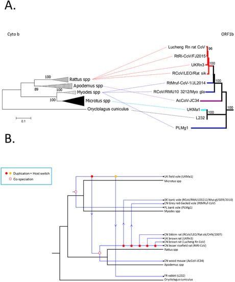 To determine the extent to which the rodent CoVs may have co-diverged with their rodent hosts, indicative of a very long-term virus-host association, we examined the extent of congruence between the virus ORF1b (with the same topology observed in the N gene) and host mitochondrial (mt) cytochrome b phylogenies by inferring tanglegrams (Figure 5A). The tanglegram was generated by linking the phylogenies of rodent alpha-CoV ORF1b to their equivalent rodent species and assessing whether there were changes in the branching order in the two phylogenies, which would indicate cross-species transmission. The rabbit (Oryctolagus cuniculus; order Lagomorpha) sequence was used as outgroup as it has previously been shown to be closely related to the Rodentia order []. Notably, the topology of the cytochrome b tree did not fully match that observed for the rodent alpha-CoVs, in which PLMg1 (Myodes spp.) fell basal to all the other viruses, and RtMruf and RCoV/RMU10 3212/Myo gla/GER/2010 (Myodes spp.) were more closely related to Rattus spp. coronaviruses (UKRn3, Lucheng Rn, RtRl). Moreover, the rodent UKMa1 (Microtus spp.) clustered with L232 (Oryctolagus cuniculus) in the ORF1b tree, again indicative of some cross-species virus transmission.