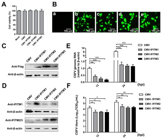 Overexpression of IFITMs inhibits classical swine fever virus (CSFV) replication in porcine alveolar macrophages (PAMs). (A) Cell viability of cell lines stably overexpressing IFITMs. (B) Confirmation of CMV-IFITM1, CMV-IFITM2, and CMV-IFITM3 lentivirus transfection by detection of enhanced green fluorescent protein (EGFP) reporter. (a) Mock-transfected PAMs. (b) PAMs transfected with lentiviruses expressing CMV. (c) PAMs transfected with CMV-IFITM1 lentivirus, CMV-IFITM2 lentivirus (d), and CMV-IFITM3 lentivirus (e). Scale bars, 100 μm. (C) Western blot analysis of PAM cell lines stably expressing Flag-tagged IFITM1, IFITM2, or IFITM3 or CMV alone using an anti-Flag antibody. (D) Western blot analysis of IFITMs in PAM cell lines stably expressing Flag-tagged IFITM1, IFITM2, or IFITM3 or CMV alone using an IFITM1-specific antibody and an IFITM2/3 antibody against IFITM2 and IFITM3, respectively. β-actin served as an internal control. (E) CSFV genomic RNA in CMV-IFITM1, CMV-IFITM2, and CMV-IFITM3 cell lines. The CMV, CMV-IFITM1, CMV-IFITM2, and CMV-IFITM3 cell lines were infected with CSFV at a multiplicity of infection (MOI) of 1. CSFV genomic RNA levels were determined by real-time quantitative PCR (RT-qPCR) at 12 and 24 h post-infection (hpi). Data were normalized to β-actin expression. (F) Infectious progeny viral titers in culture medium from CMV-IFITM1, CMV-IFITM2, and CMV-IFITM3 cells. The viral titers of CSFV in supernatants were quantified by an immunofluorescence assay (IFA) and expressed as tissue culture infective dose (TCID50)/mL. Data (A,E,F) represent the mean ± SD of three independent experiments and were measured in technical duplicate. Comparisons between groups were performed by Student’s t test. * p < 0.05, ** p < 0.01 and *** p < 0.001.