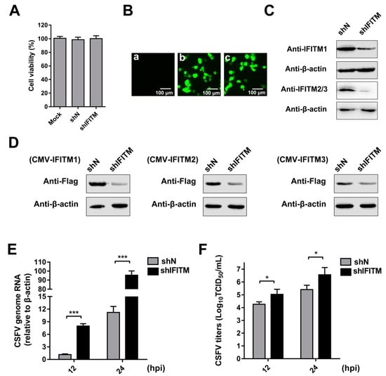 To directly explore the role of endogenous IFITMs in CSFV replication, we constructed cell lines stably transfected with IFITM shRNA using a lentiviral packaging system. Because IFITM1, IFITM2, and IFITM3 show high amino acid sequence similarity in swine [21,22], we designed one shRNA primer targeting IFITM1, IFITM2, and IFITM3. PAMs were transfected with shIFITM or shN. A cell viability assay was performed in the cell lines. The results showed that the growth and viability of shN and shIFITM cells were similar to those of the control (Figure 2A). Green fluorescence was visualized in shN and shIFITM cells under an inverted fluorescence microscope; however, no green fluorescence was detected in the mock-transfected cells (Figure 2B). To confirm that knockdown by shRNA was successful, we measured protein levels of the three IFITMs. Because we could not find an antibody that can distinguish endogenous IFITM2 and IFITM3, two experiments were performed. Firstly, we examined endogenous expression of IFITMs in mock, shN, and shIFITM cells using an anti-IFITM1 PAb and an anti-IFITM2/3 PAb (Figure 2C). We found that the expressions of IFITM1 and IFITM2/3 were notably reduced in shIFITM cell lines compared with those in shN cells. Furthermore, we detected expression of IFITMs in mock, shN, and shIFITM cells following overexpression of the three IFITMs. As shown in Figure 2D, we found that the shRNA designed to target IFITMs potently downregulated expression of the three IFITMs. shIFITM and shN cells were infected with CSFV at an MOI of 1 at 12 hpi and 24 hpi. CSFV genomic RNA (Figure 2E) and CSFV titers (Figure 2F) in supernatants were significantly enhanced by downregulation of the IFITM protein. Combined with the results described in 3.1, the anti-CSFV nature of IFITM1, IFITM2, and IFITM3 was revealed.
