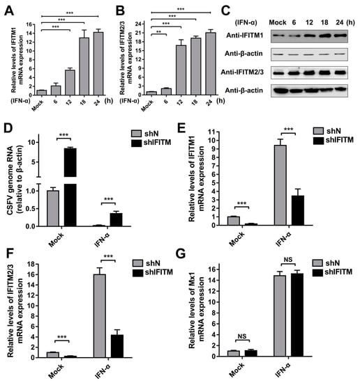 Expression of IFITMs is induced by interferon (IFN)-α treatment. RT-qPCR analysis of IFITM1 (A) and IFITM2/3 (B) mRNA levels (normalized to β-actin expression) in PAMs treated with IFN-α (10 ng/mL) at 6, 12, 18, and 24 h post-treatment (hpt). (C) Western blot analysis of IFITM expression in PAMs treated with IFN-α (10 ng/mL) at 6, 12, 18, and 24 hpt. β-actin served as an internal control. (D) CSFV genomic RNA in shIFITM cell lines with IFN-α pre-treatment. The shN and shIFITM cell lines were pre-treated with IFN-α and then infected with CSFV at an MOI of 1. CSFV genomic RNA levels were determined by RT-qPCR at 24 hpi. Data were normalized to β-actin expression. RT-qPCR analysis of IFITM1 (E), IFITM2/3 (F) and Mx1 (G) mRNA levels (normalized to β-actin expression) in shN and shIFITM cells. Data (A,B,D,E–G) represent the mean ± SD of three independent experiments and were measured in technical duplicate. Comparisons between groups were performed by Student’s t test. ** p < 0.01 and *** p < 0.001
