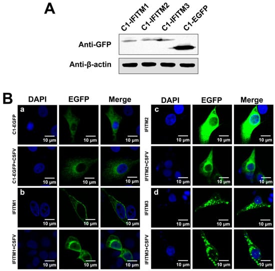 After we demonstrated that CSFV inhibits IFITM expression, we examined whether CSFV affected IFITM distribution. Because cellular localization of IFITM1, IFITM2, and IFITM3 had not been reported in PAMs, we constructed three plasmids (C1-IFITM1, C1-IFITM2, and C1-IFITM3) with IFITM1, IFITM2, and IFITM3 fused to EGFP to facilitate detection, respectively. Protein expression of IFITM1, IFITM2, and IFITM3 was confirmed by western blot (Figure 5A). PAMs transfected with C1-IFITM1, C1-IFITM2, C1-IFITM3, or empty vector (C1-EGFP) for 24 h were subsequently infected with CSFV (MOI = 1) for another 24 h. The distribution of the IFITM-EGFP protein was observed by laser scanning confocal microscopy. As shown in Figure 5B-b, IFITM1 was mainly distributed on the surface of the mock-infected PAMs with some intracellular localization. In the infected PAMs, IFITM1 appeared to be partially removed from the cell surface. As shown in Figure 5B-c and -d, IFITM2 and IFITM3 was predominantly located in intracellular compartments in the cytoplasm, which did not obviously change in CSFV-infected PAMs.