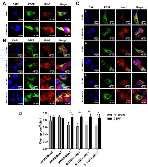 It has been reported that CSFV entry into PK-15 cells and PAMs depends on endocytosis. In addition, both Rab5 and Rab7 are required for endocytosis and subsequent productive CSFV infection [31,32]. Given that IFITM restriction of viral infection could be mediated by the endocytic pathway, we hypothesized that overexpressed IFITMs may colocalize with endosomal compartments to interfere with CSFV infection in PAMs. PAMs were transfected with plasmids expressing EGFP-IFITM1, EGFP-IFITM2, and EGFP-IFITM3 fusion proteins for 24 h and infected with CSFV (MOI = 1). Immunofluorescence colocalization analysis showed that IFITM2 partially colocalized with Rab5 (Figure 7A) and Rab7 (Figure 7B-a) in mock-infected and infected cells. IFITM3 was partially colocalized with Rab7 in PAMs even following the CSFV infection (Figure 7B-b). Interestingly, IFITM1, IFITM2, and IFITM3 were found to colocalize with Lamp1 in mock-infected and CSFV-infected cells (Figure 7C). The overlap coefficient is shown in Figure 7D. Therefore, these results revealed colocalization of IFITMs with Rab5, Rab7, and Lamp1 during CSFV infection.