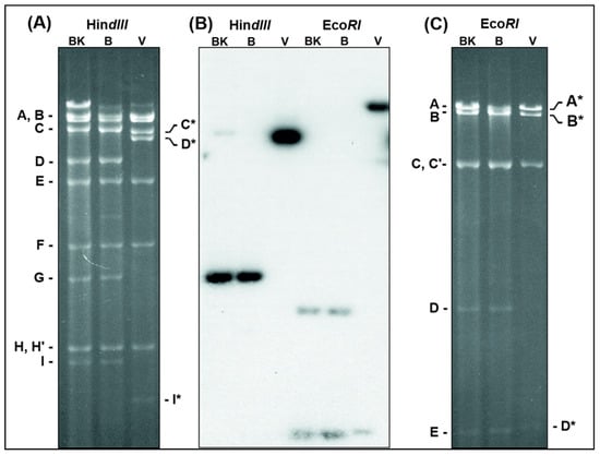 Changes of D1701-V DNA restriction fragment patterns. DNA of D1701-50BK (lanes BK), D1701-B (lanes B) and D1701-V (lanes V) was digested with HindIII or EcoRI and separated in a horizontal 0.8% agarose gel for 36 h. The digested DNAs were run in one identical gel, however, for clearer representation of the individual DNA fragments the photograph of the ethidium-bromide stained gel was split into the shown parts (A) and (C), respectively. (B) Demonstrates the X-ray after Southern blot hybridization of the gel with the 32P-labelled HindIII-fragment G of D1701-B. Those DNA fragments changed after Vero cell culture passaging are marked by a star.