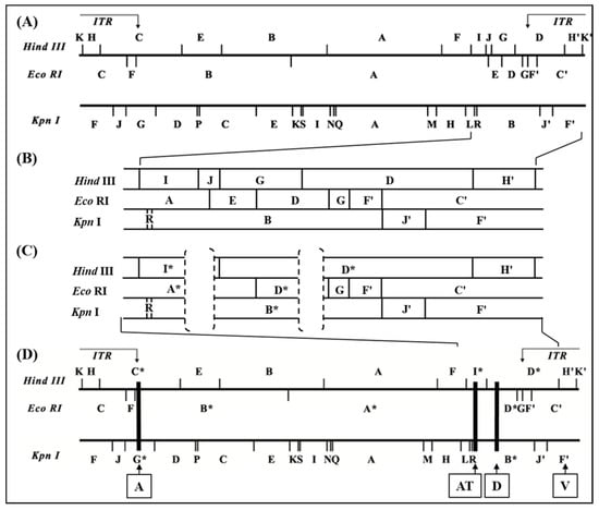 The second deleted part in D1701-V is designated D and comprises 2,195 bases and is located 7,920 bases to the right of locus AT, which resulted in the loss of another HindIII site between fragments G and D of D1701-B (Figure 2). Therefore, the HindIII fragment G is no more existent in D1701-V but the enlarged fragment D* (Figure 2C). Finally, a third deleted region named A was detected in the left-hand terminus of D1701-V (Figure 2D) and comprises 2,255 bases resulting in the truncated D1701-V fragments HindIII – C*, EcoRI – B* and KpnI – G* (Figure 1 and Figure 2D).
