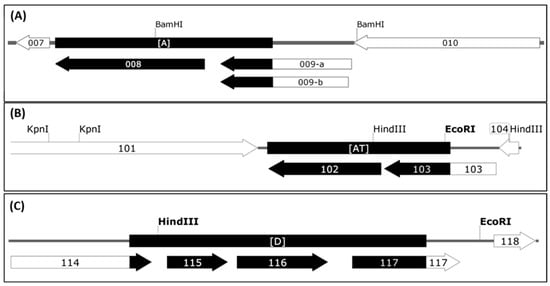 Open reading frames affected by the 3 deletions in D1701-V. The ORFs of the genomic regions inclosing deletions A (A), AT (B) and D (C) are depicted. The ORFV genes are numbered according to Delhon et al. [], the deleted parts are shown with black boxes and black arrows. The gene maps were constructed using SnapGene Viewer software.
