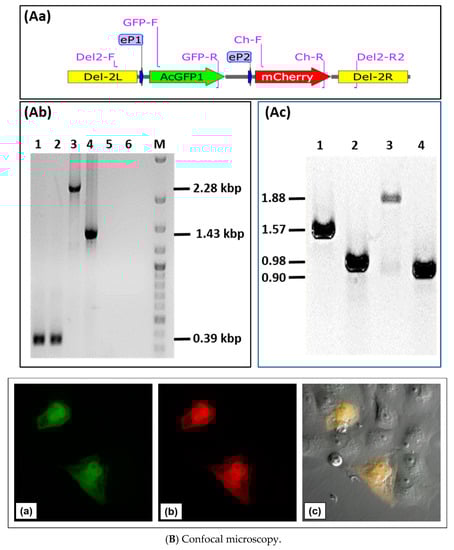 Next, we tested the possibility of insertion and expression of two different transgenes in locus D of D1701-V. Plasmid pD1-AcGFP-D2-mCherry was constructed to allow expression of the two fluorescent marker genes AcGFP and mCherry in locus D. To this end, the HindIII-SpeI fragment of pAcGFP was inserted into plasmid pD12-mCherry to control AcGFP expression by promoter eP1, whereas mCherry expression remained regulated by promoter eP2 (Figure 5Aa). Vero cells were infected with the ORFV recombinant D12-Cherry and nucleofected with plasmid pD1-AcGFP-2-mCherry. After selection of candidates for the new recombinant D1701-V-D1-AcGFP-2-mCherry, abbreviated as D1-GFP-2-Cherry, PCR assays were used for identification. Insertion of both genes into locus D was demonstrated with the PCR primer combination Del2-F plus Del2-R2 (Figure 5Aa for primer location, Table 1). In case of the empty D1701-V this PCR led to the 0.39 kbp amplicon (Figure 5Ab, lanes 1 and 2) but after insertion of AcGFP and mCherry it produced a specific amplicon of 2.28 kbp (Figure 5Ab, lane 3), whereas the smaller 1.43 kbp PCR product was obtained with the parental virus D12-Cherry (Figure 5Ab, lane 4). No amplification was seen with both negative controls (Figure 5Ab, lanes 5 and 6). Figure 5Ac exemplifies the possibility of transgene-specific PCR using the following primer combinations: Lane 1 shows the 1.57 kbp product with primer GFP-F plus Ch-R comprising parts of the AcGFP and mCherry gene, lane 2 the 0.98 kbp amplicon with primer Del2-F plus GFP-R, lane 3 the 1.88 kbp product with primer GFP-F plus Del2-R2 and lane 4 amplification of 0.90 kbp with primer Ch-F plus Del2-R2. Together, the established PCR assays enable not only gene-specific but also insertion site-specific detection with DNA isolated from recombinant virus-infected cells. To get an idea on the sensitivity of the PCR tests, reconstruction experiments revealed a limit of detection of ca. 8 copies of D12 recombinant DNA per 100 cells using PCR Del2-FR2 and ca. 1 genome copy per 600 cells applying PCR Ch-FR.