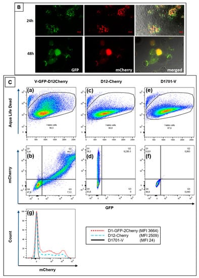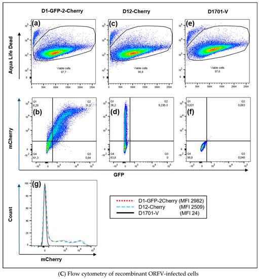 Twenty-four hours after infection with approximately moi 2.0 of the recombinant D1-GFP-2-Cherry, 31.5% of almost 98% viable cells were found double positive for AcGFP and mCherry expression (Figure 5Ca,b-Q2). D12-Cherry infection resulted in only mCherry single positive cells (36.2%) and were negative for GFP (Figure 5Cc,d). As expected neither GFP- nor mCherry-positive cells were detectable after infection with ORFV D1701-V (Figure 5Ce,f). In all cases approximately 96% viable cells were obtained (Figure 5Ca,c,e). The histogram illustrates that almost identical numbers of mCherry-positive cells could be detected in both D1-GFP-2-Cherry- and D12-Cherry-infected cells (Figure 5Cg). Two mCherry-positive cell populations appeared after infection with both mCherry containing recombinants differing in the amount of expressed mCherry (Figure 5Cg). This can be explained by the presence of cells containing differing amounts of mCherry produced, since the infectious cycle was not synchronized.