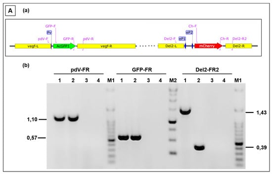 All these properties favour ORFV D1701-V as a promising live virus vector platform for delivering various heterologous microbial antigens to the immune system. The possibility to insert foreign genes into the vegf-e (V) locus, which encodes an important virulence factor [,,], allowed us for the first time the generation of ORFV recombinant vaccines that mediate excellent and long-term protective immune responses against diverse viral infections in different hosts without the need of an adjuvant such as demonstrated in mouse, dog, cat, cattle, swine or rabbit [,,,,,,,]. Parapoxvirus replication is restricted to the cytoplasm and the temporarily regulated gene expression is divided into immediate early, early, intermediate and late phases as characteristic for poxviruses [,,,,]. In all our ORFV recombinants until now we utilized the authentic early promoter of the substituted vegf-e gene (Pv) enabling strong early transgene expression without the need of ORFV genome replication or production of infectious virus and therefore, exhibiting properties of a replication-deficient vaccine. During these studies we found that expression of several foreign genes successively inserted into the vegf-e (V) locus and controlled only by the Pv promoter was not as strong as after regulation of each transgene by a distinct promoter []. Improvements on the utility of the ORFV vector system are desirable in terms of providing additional insertion sites for more foreign genes associated with new early ORFV promoters. Also an acceleration of the selection procedure of recombinant ORFV would be advantageous, because the integration of foreign genes relies on intermolecular homologous recombination with transfer plasmids transfected into virus infected cells [], which requires tedious selection by multiple rounds of picking single virus plaques. The use of fluorescent marker genes was reported to facilitate the selection process for the isolation of virus recombinants [,], for example, by red-to-green gene swapping [], which was also the basis for a flow cytometric selection and purification protocol of VACV MVA recombinants [].