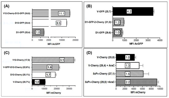 Comparison of strength of the promoters Pv, eP1 and eP2 by flow cytometry. Vero cells were infected in triplicates with the indicated ORFV recombinants for 22 h and the mean fluorescence intensity (MFI) was measured by flow cytometry. The numbers in parentheses behind the name of each recombinant indicate the percentage of positive cells determined by flow cytometry. The numbers in the bars denote the multiple of the particular lowest MFI set to 1.0. (A) Activities of eP1 and eP2 in insertion site D directing expression of AcGFP gene. The lowest MFI was found with promoter eP1 (recombinant D1-GFP) and set to 1.0, whereas expression from eP2 was 11.1- or 9.5-fold stronger after infection with V12-Chery-D12-GFP or D12-GFP, respectively. (B) Again, the lowest promoter activity was demonstrated from eP1 (recombinant D1-GFP and D1-GFP-2-Cherry) but 4.2-fold higher expression strength by promoter PV. (C) Expression of mCherry in insertion site V under control of Pv (recombinant V-Cherry) yielded the lowest MFI (set to 1.0) but was 3.1-fold higher when controlled by eP2 (recombinant V12-Cherry). Expression in the D locus showed that the eP2 led to 1.9 higher (recombinant V-GFP-D12-Cherry) or 1.7 higher (recombinant D12-Cherry) MFI. (D) The effect of a tandem arrangement of 5 core elements of Pv (recombinant 5xPv-Cherry) on the expression of mCherry in the V locus was compared to that of the single Pv (V-Cherry; set to 1.0). Vero cells were infected in the absence or in the presence of AraC (+ AraC).