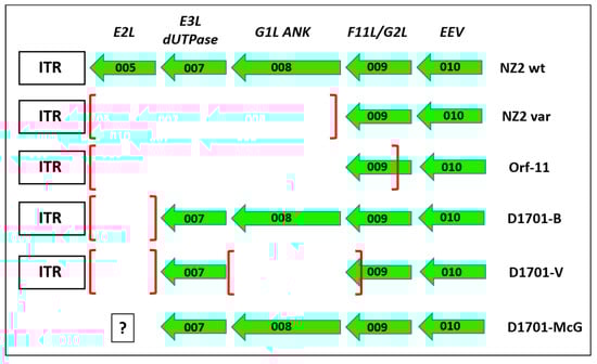 Comparison of gene deletions in the left hand end of ORFV genomes The gene deletions mapped in the left terminus of the genome of the different cell culture passaged ORFV variants NZ2var [] and Orf-11 [] are depicted in comparison to the prototype ORFV wild-type (wt) strain NZ2 and to the D1701 derivatives as explained in the text. The earlier first designations for the ORFV genes are given in the upper line, EEV means that this ORF010 encodes an ORFV envelope protein. ITR denotes the inverted terminal region. The framed question mark given for D1701 virus sequenced by McGuire (D1701-McG) indicates the lack of sequence data left to the ORF007. The squared brackets mark the deleted part in each virus variant.