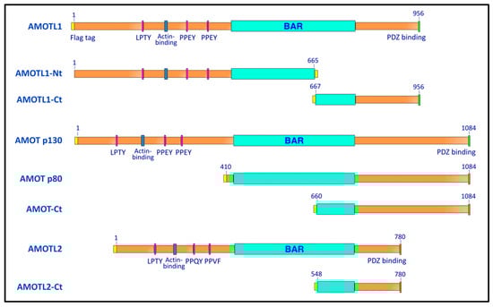 Plasmids pCAGGS-AMOTL1, pCAGGS-AMOTL1-Ct, and pCAGGS-AMOTL1-Nt have been described previously []. cDNAs corresponding to human AMOT p130 (NCBI NM_001113490), AMOT p80 (NCBI NM_133265), and AMOTL2 (NCBI NM_016201) were kind gifts from Dr. Wesley Sundquist and were obtained via the DNASU repository (dnasu.org). These were modified by PCR to append Flag (DYKDDDDK) tags to their N-termini and subcloned into the pCAGGS vector [] to generate pCAGGS-AMOT p130, pCAGGS-AMOT p80, and pCAGGS-AMOTL2. AMOT p130 cDNA was further modified by PCR to generate AMOT-Ct having boundaries as indicated in Figure 1. AMOTL2 cDNA was likewise modified to generate AMOTL2-Ct. Boundary points for AMOT-Ct and AMOTL2-Ct were selected based on alignments of the amino acid sequences to that of AMOTL1-Ct using ClustalW2 []. pCAGGS-AMOTL1-AAEY310 was generated by PCR mutagenesis of pCAGGS-AMOTL1, changing the PPEY sequence starting at amino acid residue 310 to AAEY. Likewise, pCAGGS-AMOTL1-AAEY367 was generated, changing the PPEY sequence starting at residue 367 to AAEY. pCAGGS-AMOTL1-AAEY310,367 changes both of these PPEY sequences to AAEY. This double mutant was further modified by PCR to generate the triple mutant pCAGGS-AMOTL1 ∆L/PPXY, in which the LPTY sequence starting at residue 188 is changed to AATY and the PPEY sequences starting at residues 310 and 367 are both changed to AAEY. DNA sequencing of the entire genes was carried out to verify their identities (Eurofins Genomics, Louisville, KY, USA).