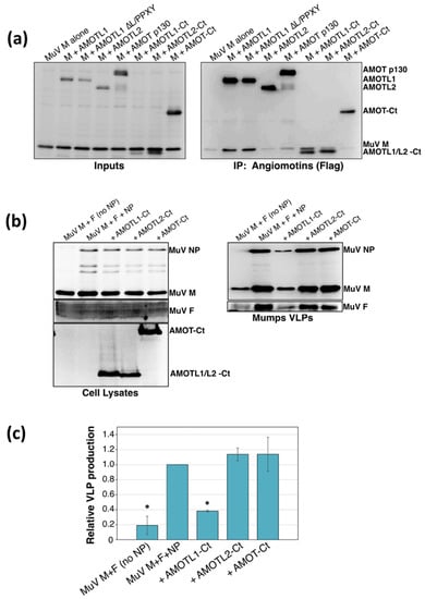 To generate PIV5 VLPs, 293T cells grown in 6-cm dishes to 70–80% confluency in DMEM supplemented with 10% fetal bovine serum were transfected with pCAGGS plasmids encoding PIV5 M protein or M-PPXY protein (0.4 µg/dish), PIV5 NP protein (0.1 µg/dish), and PIV5 HN protein (1.5 µg/dish). Mumps VLPs were generated using pCAGGS plasmids encoding mumps virus M protein (0.4 µg/dish), mumps virus NP protein (0.1 µg/dish), and mumps virus F protein (0.1 µg/dish). In some cases, the viral components were transfected together with additional pCAGGS plasmids encoding AMOT-Ct, AMOTL1-Ct, or AMOTL2-Ct (all at 0.1 µg/dish). Transfections were carried out in Opti-MEM using Lipofectamine-Plus reagents. At 24 h p.t., the culture medium was replaced with DMEM containing 2% FBS, 1/10 the normal amount of methionine and cysteine, and 37 µCi of [35S] Promix/mL. After an additional 16–18 h, cell and media fractions were collected. VLPs from the culture media fractions were pelleted through 20% sucrose cushions, resuspended, floated to the tops of sucrose flotation gradients, pelleted again, and then resuspended in SDS-PAGE loading buffer containing 2.5% (w/v) dithiothreitol, as described previously []. Cell lysate preparation and immunoprecipitation of proteins from the cell lysate fractions were carried out as described []. Antibodies for immunoprecipitation of viral proteins are the same as those described above for co-immunoprecipitation. Anti-Flag M2 magnetic beads were used to immunoprecipitate angiomotin-derived polypeptides. The precipitated proteins and VLPs were separated on 10% SDS gels and detected using a Fuji FLA-7000 phosphorimager. VLP production efficiency was calculated as the quantity of M protein in purified VLPs divided by the quantity of M protein in the corresponding cell lysate fraction, normalized to the value obtained in the positive control experiment.