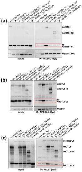 Similar results were obtained when using NEDD4-1 (Figure 6b) or NEDL1 (Figure 6c) in place of NEDD4L. Only AMOTL1 that possesses L/PPXY motifs and the C-terminal M-binding region was able to act as a linker to allow M co-precipitation with NEDD4-1 or NEDL1. These results demonstrate that at least three different NEDD4 family proteins can be indirectly recruited to a paramyxovirus M protein through AMOTL1.