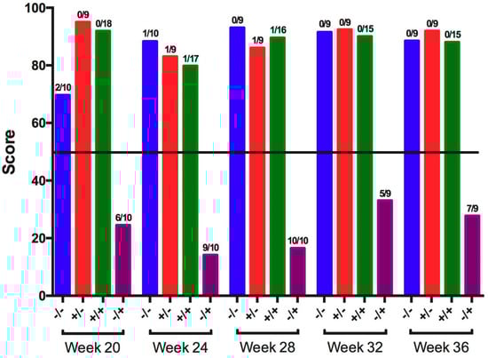Ciliostasis protection scores among tracheas collected 5 days post-challenge with IBV GA98 for different groups of birds challenged at 20, 24, 28, 32, and 36 weeks of age (WOA). Groups with a protection score >50 (horizontal line) are protected, and groups with a protection score <50 are not protected. Fractions above each bar represent the proportion of birds positive for ciliostasis for the respective group. −/− = non-vaccinated/non-challenged, +/− = vaccinated/non-challenged, +/+ = vaccinated/challenged, −/+ = non-vaccinated/challenged.