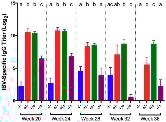IBV-specific IgG titers in serum collected 5 days post-challenge with IBV GA98 for different groups of birds challenged at 20, 24, 28, 32, and 36 WOA. Letters (a–c) indicate significant differences among vaccine and challenge groups for each week (p < 0.05). −/− = non-vaccinated/non-challenged, +/− = vaccinated/non-challenged, +/+ = vaccinated/challenged, −/+ = non-vaccinated/challenged.