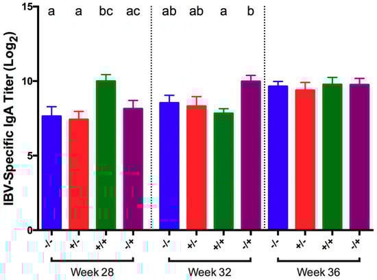 Tear IBV-specific IgA titer in tears collected 5 days post-challenge with IBV GA98 for different groups of birds challenged at 20, 24, 28, 32, and 36 WOA. Letters (a–c) indicate significant differences among vaccine and challenge groups for each week (p < 0.05). −/− = non-vaccinated/non-challenged, +/− = vaccinated/non-challenged, +/+ = vaccinated/challenged, −/+ = non-vaccinated/challenged.