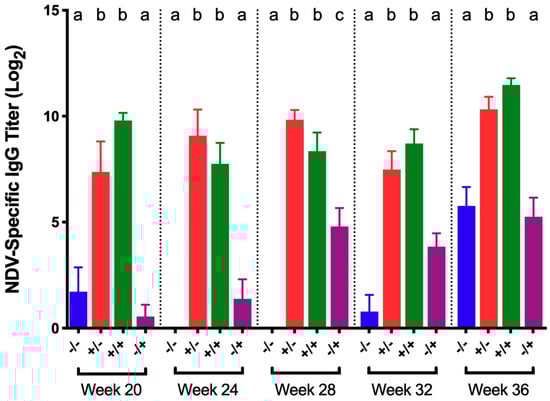 NDV-specific IgG titers in serum collected 5 days post-challenge with NDV B1 vaccine for different groups of birds challenged at 20, 24, 28, 32, and 36 WOA. Letters (a–c) indicate significant differences among vaccine and challenge groups for each week (p < 0.05). −/− = non-vaccinated/non-challenged, +/− = vaccinated/non-challenged, +/+ = vaccinated/challenged, −/+ = non-vaccinated/challenged.