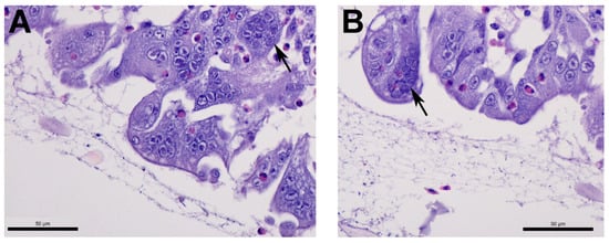 Tracheal microscopic lesions consistent with infectious laryngotracheitis infection at 20 weeks-of-age. (A) Numerous syncytia with intranuclear inclusions (arrow). (B) Another trachea from the same group demonstrating syncytia with intranuclear inclusions (arrow).
